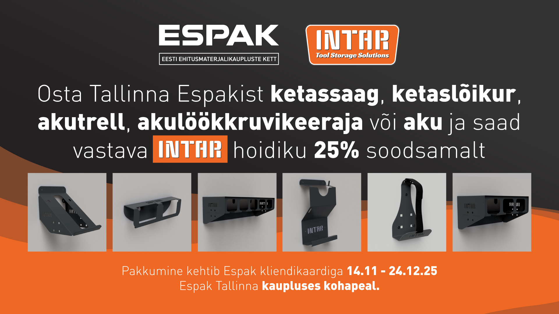Osta Espak Tallinna kauplusest tööriist ja saad vastava INTAR hoidiku 25% soodsamalt! Pakkumine kehtib kliendikaardiga 14.11 - 24.12.25 Espak Tallinn kaupluses kohapeal.