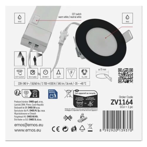 ALLVALGUSTI LED LORI 4,5W MUST 2700K-4000K 345LM IP20/65 EMOS