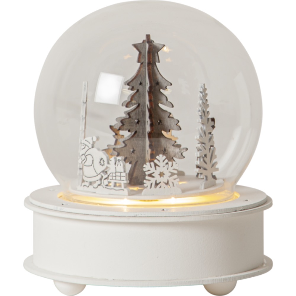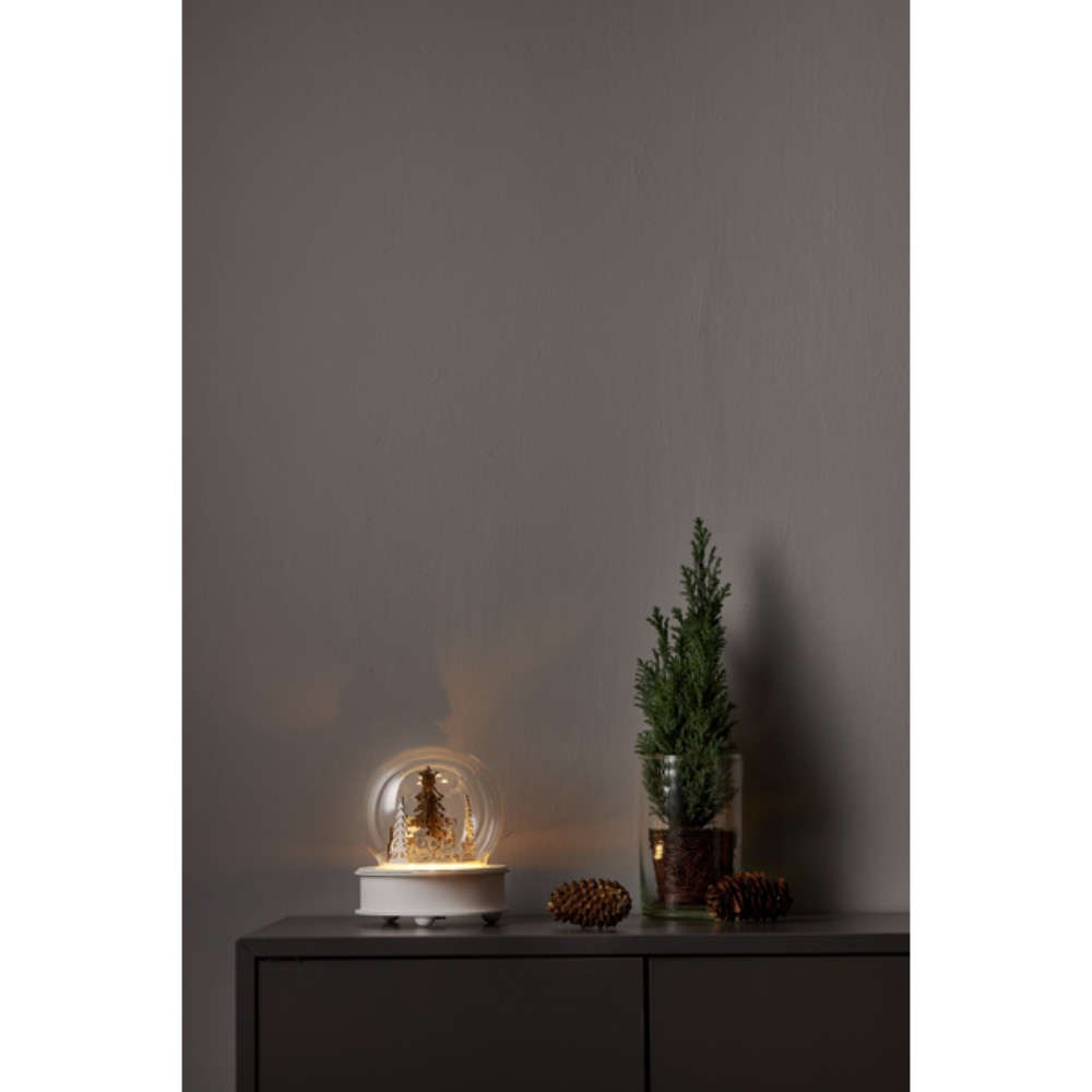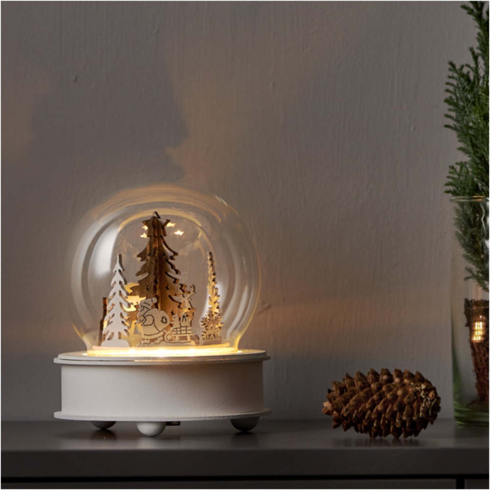 Klaaskuuliga muusikatoos pöörleb ja helendab, kui üles keerata.