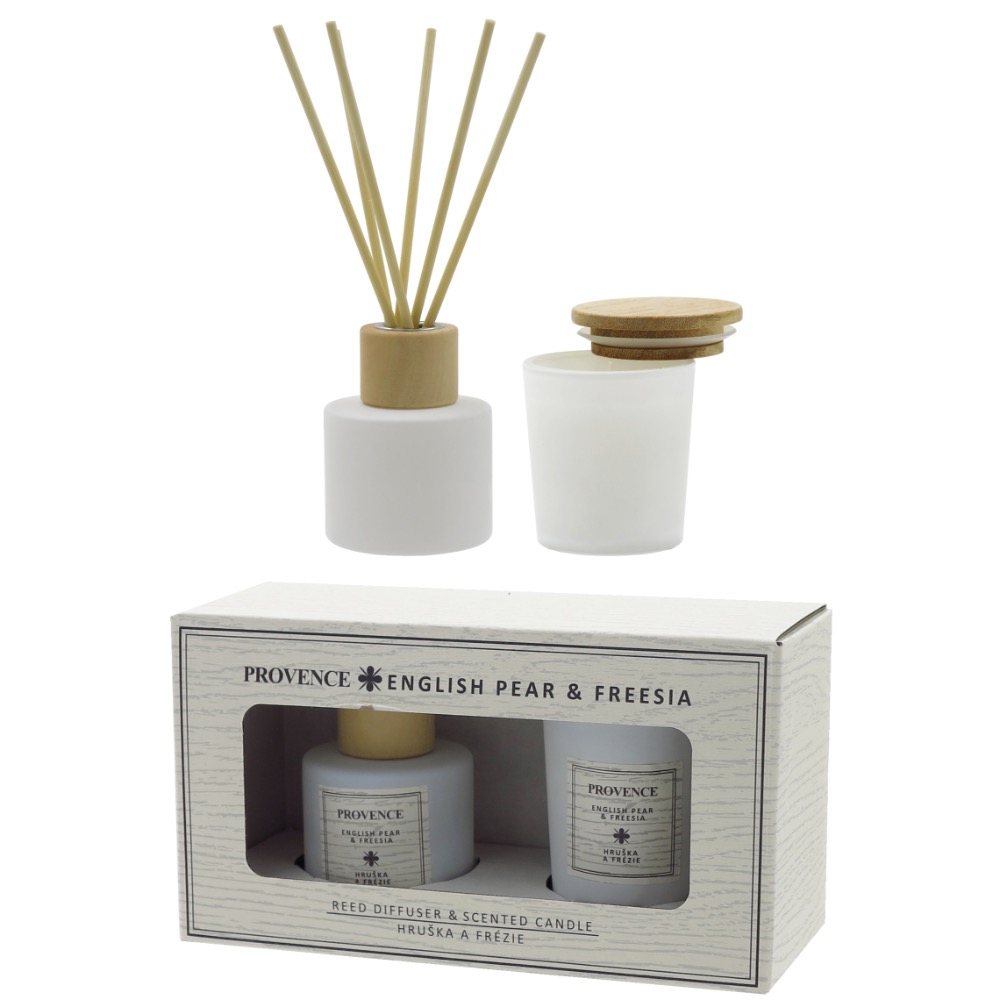 Kinkekomplekt õhuvärskendaja + lõhnaküünal Inglise pirn & Freesia
