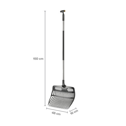 Fiskars kühvel-reha on ideaalne tööriist suuremahuliste materjalide – nagu muru, langenud puulehtede, okste ja viljade või sõnniku – riisumiseks, tõstmiseks, sõelumiseks ja teisaldamiseks aias või laudas.