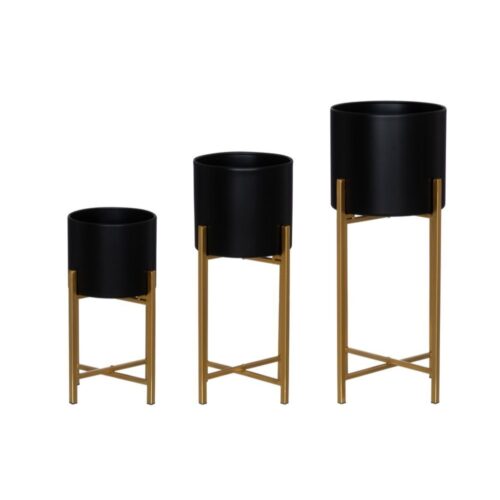 Stiilne sepistatud lillealus musta kaitsva poti ja kuldse alusega.
