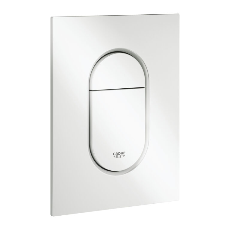 Valge GROHE Arena Cosmopolitan S loputusnupp seinasiseste WC raamide jaoks – vett säästev ja minimalistliku disainiga.
