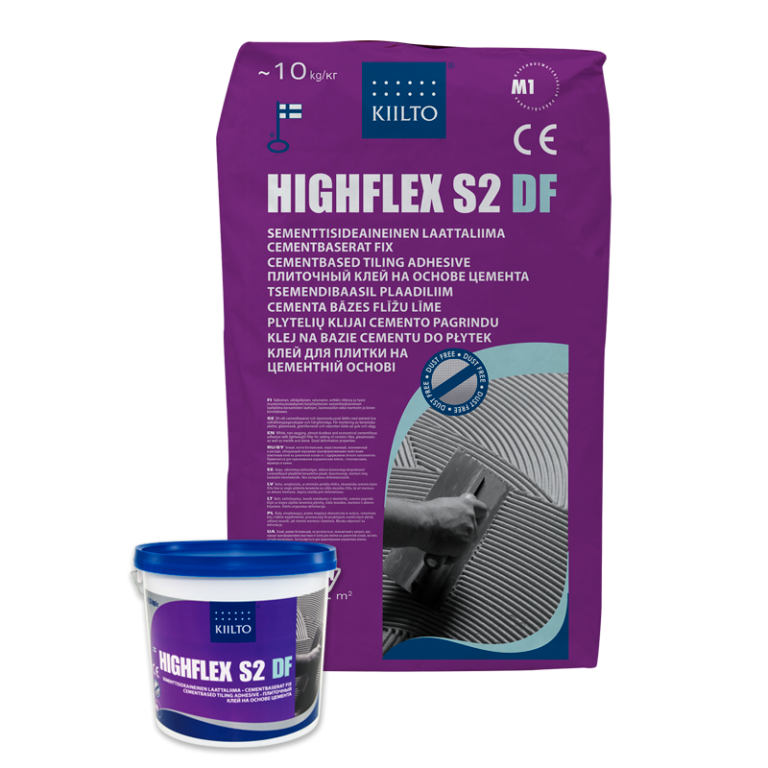 Kasutusalad: Kiilto Highflex S2 DF on valge, mittevalguv ja väikese kulunormiga ja hästi deformatsiooni taluv kergsideainel plaatimissegu keraamiliste, klaasmosaiik-, marmor- ja kiviplaatide kinnitamiseks. Uus vähetolmav tehnoloogia vähendab oluliselt segu tolmamist segamisel. Sobivad aluspinnad on näiteks plast-, värvitud, kahhel-, klinker ja tavalised kivimaterjalipinnad ning Kiilto hüdroisolatsioonimastiksiga või Kiilto niiskustõkkega töödeldud kipskartong- või kiudtsementplaadid. Kuumadel pindadel, nagu näiteks kaminad ja kerisetagused (eramute saunades), on segu maksimum kasutus temperatuur 100 °C. Jälgida ka deformatsioonivuukide vajalikkust, plaatimise ajal peab ruumis olema normaaltemperatuur. Plaatimistööd saab sooritada ilma vuuginöörita. Põrandaküte tuleb lülitada välja u 24 tundi enne plaatimise alustamist. Sobib kasutamiseks sise- ja välistingimustes.