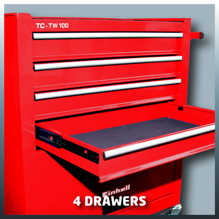 Tööriistakäru Einhell TC-TW 100 on tugev ja töökindel abiline töökojast ülevaate säilitamisel ja korras hoidmisel. Tööriistakäru käsitsemine töökojas on lihtne. Nelja koormust taluvast plastist suunda muutva tugiratta ja tõukerauaga tööriistakäru saab kasutada just seal, kus parasjagu vaja. Käepärane tööriistakäru on asendamatu igas väikeses töökojas ja seda saab hoida alaliselt iga nurgas, nagu soovite. Kahe suunda muutva tugiratta seisupidurid tagavad tööriistakäru paigalseisu täpselt seal, kus kasutaja seda soovib. Tööriistakärul TC-TW 100 on neli sujuvalt liikuvat blokisüsteemiga sahtlit ja suuremate tööriistade jaoks mõeldud katteluugiga hoiuruum. Tundlike tööriistade jaoks on olemas matiga kaetud liud. Liud on asendamatu ka pliiatsite, kruvitsate ja kruvide jaoks; mati suurendatud veeretakistus hoiab iga tööriista just seal, kuhu kasutaja selle paneb. Einhelli tööriistakäru suurim lubatud koormus on 75 kg.