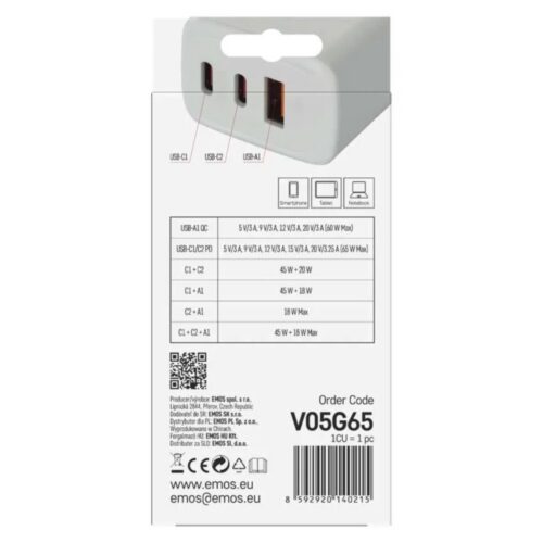 Max. väljund 1× USB: A: 5 V/3 A – 9 V/3 A – 12 V/3 A – 20 V/3 A (60 W); C1/C2: 5 V/3 A – 9 V/3 A – 12 V/3 A – 15 V/3 A – 20 V/3,25 A (65 W)